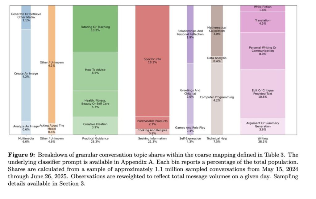 There’s some unanimity in terms of what users ask ChatGPT, too. Per the company’s working paper, nearly 80% of all conversations revolve around three topics: Practical Guidance (28.3%), Writing (28.1%), and Seeking Information (21.3%).